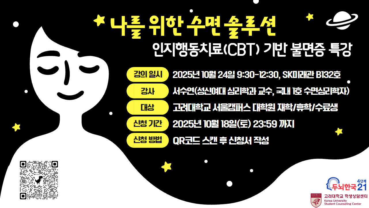 학생상담센터에서는 불면증을 겪는 학생들을 위한 심리교육특강을 준비하였습니다. 많은 관심과 참여 부탁드립니다.