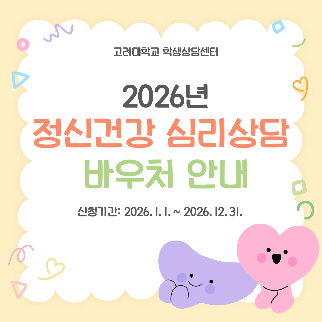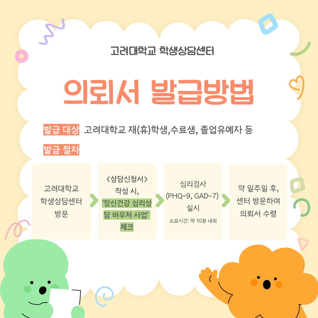 학생상담센터에서는 본교 재학생, 휴학생, 수료생들을 대상으로 정신건강 심리상담 바우처 사업 신청을 위한 의뢰서를 발급해드리고 있으니, 관심있는 학생분들은 아래 안내사항을 참고하시기 바랍니다.