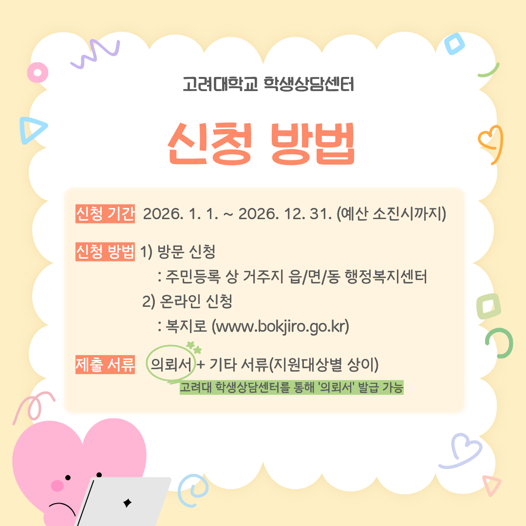 ○ 연말에는 사업비 소진 문제로 차년도에 신청이 가능한 경우가 잦으니, 늦어도 7~8월 경에는 학생상담센터를 내방하여 의뢰서 발급 절차를 밟는 것을 추천드립니다.