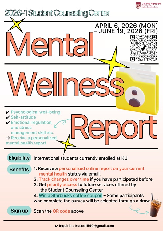 '내 마음의 보고서'는 학교생활 적응과 스트레스 관리를 돕기 위해 개인의 정신건강 수준, 자기에 대한 태도, 정서 조절 및 스트레스 대처 능력 등에 대한 개인별 결과지를 제공해 드립니다. 이전에 참여하셨던 분은 자신의 정신건강 및 심리상태의 변화추이를 확인할 수 있는 보고서를 받을 수 있어 다시 참여하는 것이 도움이 될 것입니다. 학생 여러분의 적극적인 참여 부탁드립니다.