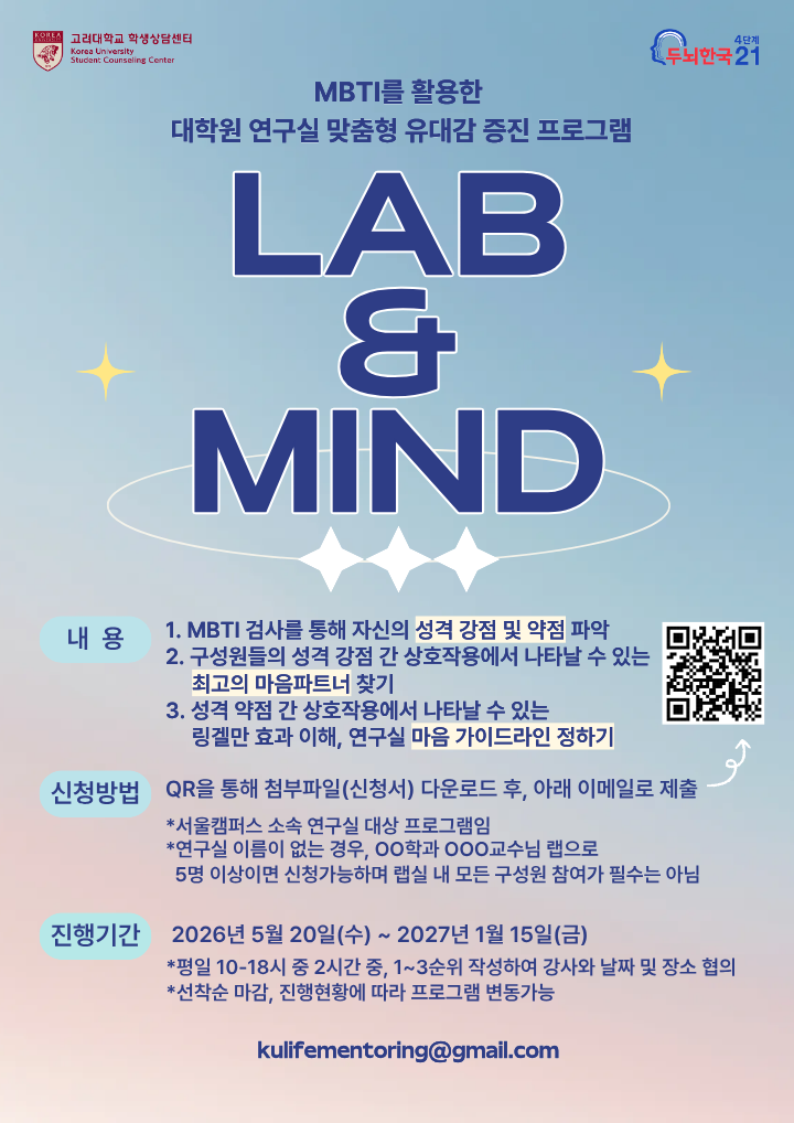 고려대 학생상담센터에서는 대학원생을 위해 연구실에서 함께 생활하는 학내 구성원 간 유대 강화 프로그램을 실시하고자 합니다. 연구실 내 상호 이해 및 소통에 관심있는 대학원생들의 많은 참여 바랍니다.